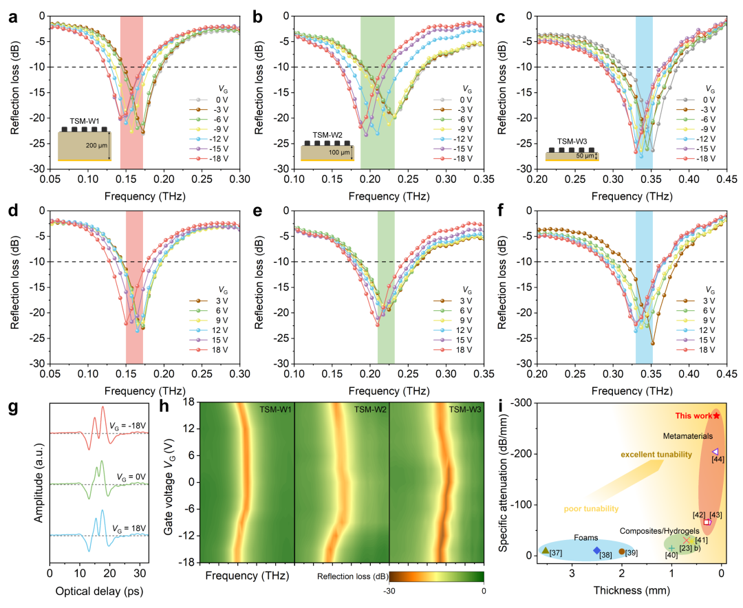 此外,该超薄吸波器在保持阻抗匹配的同时,通过巧妙结合多重损耗机制,实现了卓越的比衰减性能(−275 dB/mm)。经数值分析、有限元模拟及标准大气衰减环境实测,此TSM吸波器能在多个太赫兹大气窗口频带(0.14 THz,0.22 THz和0.34 THz)内施展动态隐身。