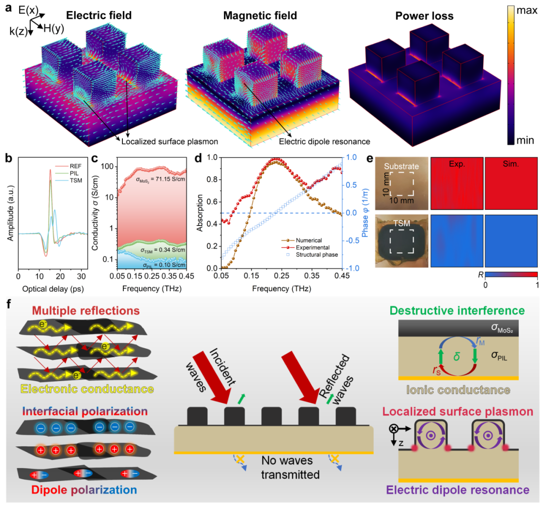 主动吸波调控对于先进隐身技术至关重要,尤其在太赫兹大气窗口新兴探测威胁的背景下。然而,太赫兹吸波超材料的研制常陷于高吸收效率与强可调谐性难以兼得的困局。研究团队展示的太赫兹隐身超材料(TSM)吸波器,核心在于其独创的分级二硫化钼/聚离子液体架构。聚离子液体(PIL)在静电场作用下,自由阴离子定向迁移,二硫化钼(MoS2)界面载流子累积,二者相辅相成,构建了“波-离子-电子”三元交互的通道。由此,既能于静默时施展“高幅值吸波”之功(被动隐身),亦可在交锋中运使“宽频率调控”之法(主动对抗)。