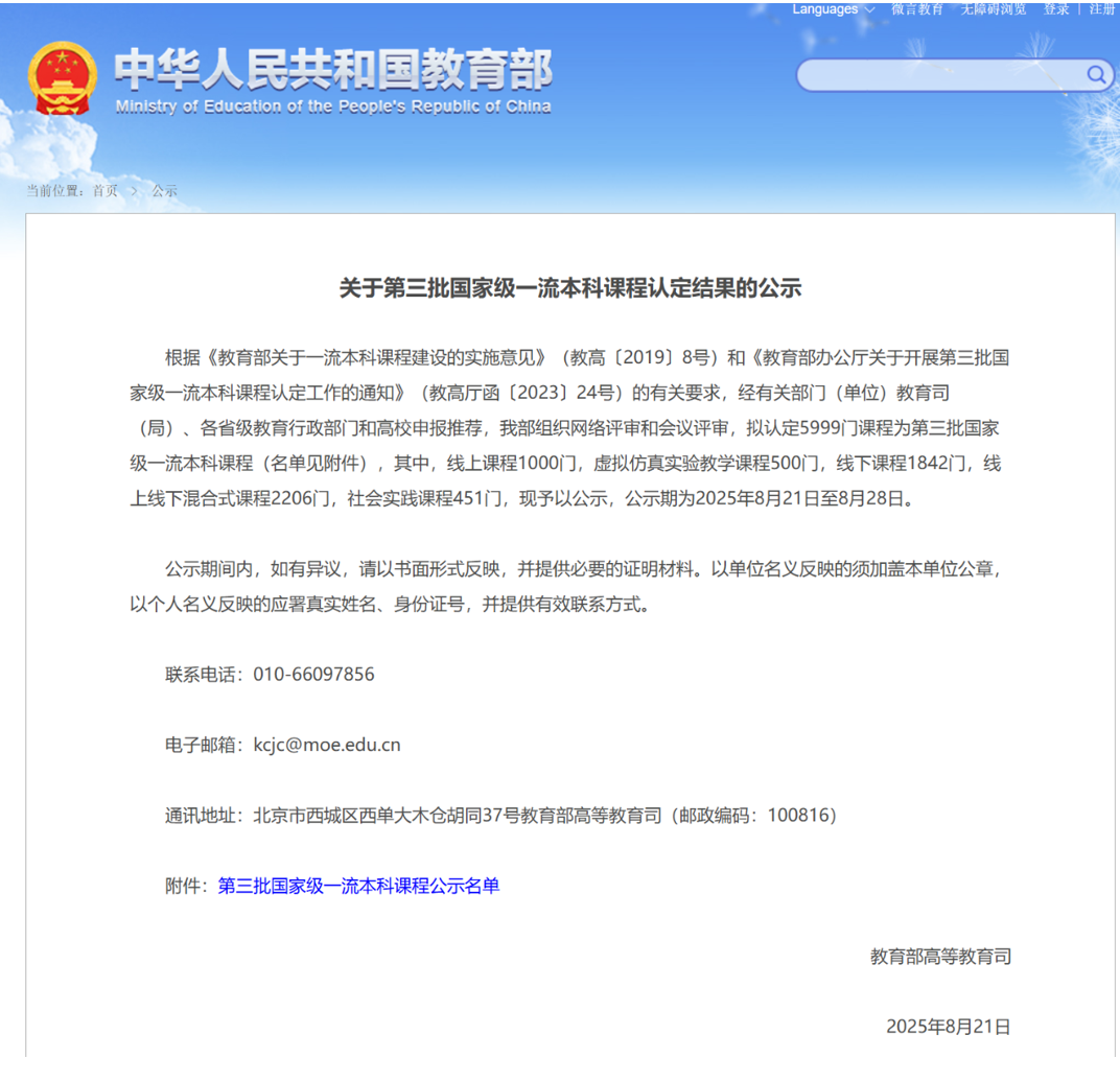 近日,教育部高等教育司发布《关于第三批国家级一流本科课程认定结果的公示》,欧冠直播