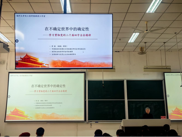 舒展老师作《在不确定世界中的确定性——学习贯彻党的二十届四中全会精神》的辅导报告。宣讲报告会由陈伟民书记主持,全院教职工和学生代表参加报告会。