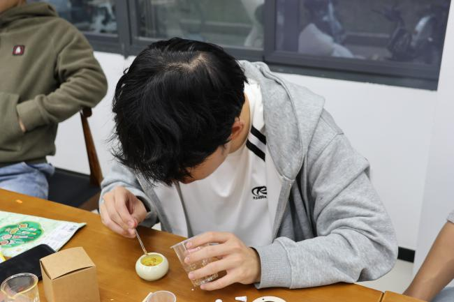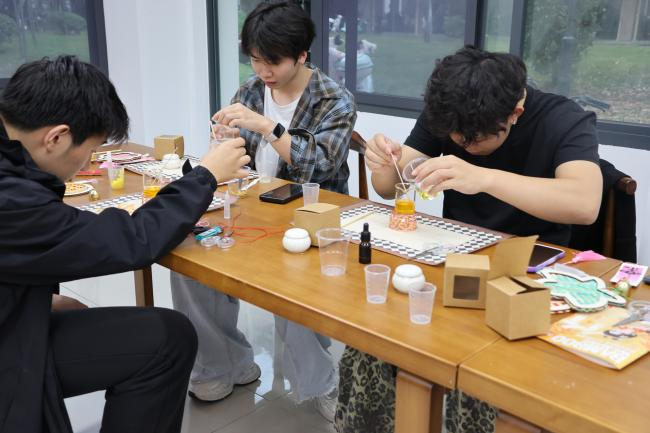材料台上,桂花干、天然蜂蜡、植物精油依次排开,像一列等待检阅的“秋日方阵”。陈恩婷老师先带大家“识香”——辨桂花品种、讲精油萃取;再示范“调香”——加热、倒模,一整套动作行云流水。最后,他公开独家“最佳配比”,让同学们手握“黄金配方”,放心大胆地把秋天锁进小小盒中。