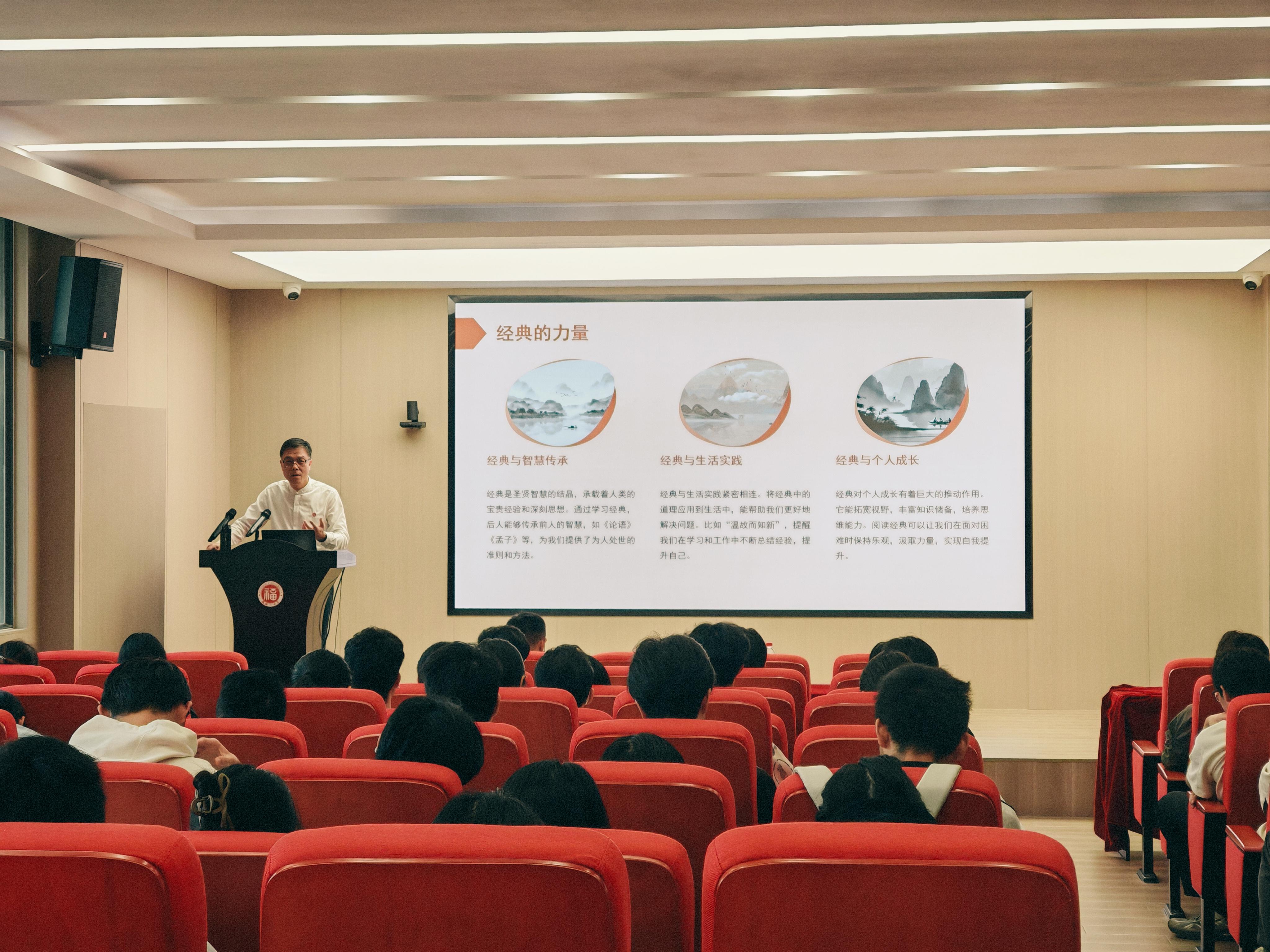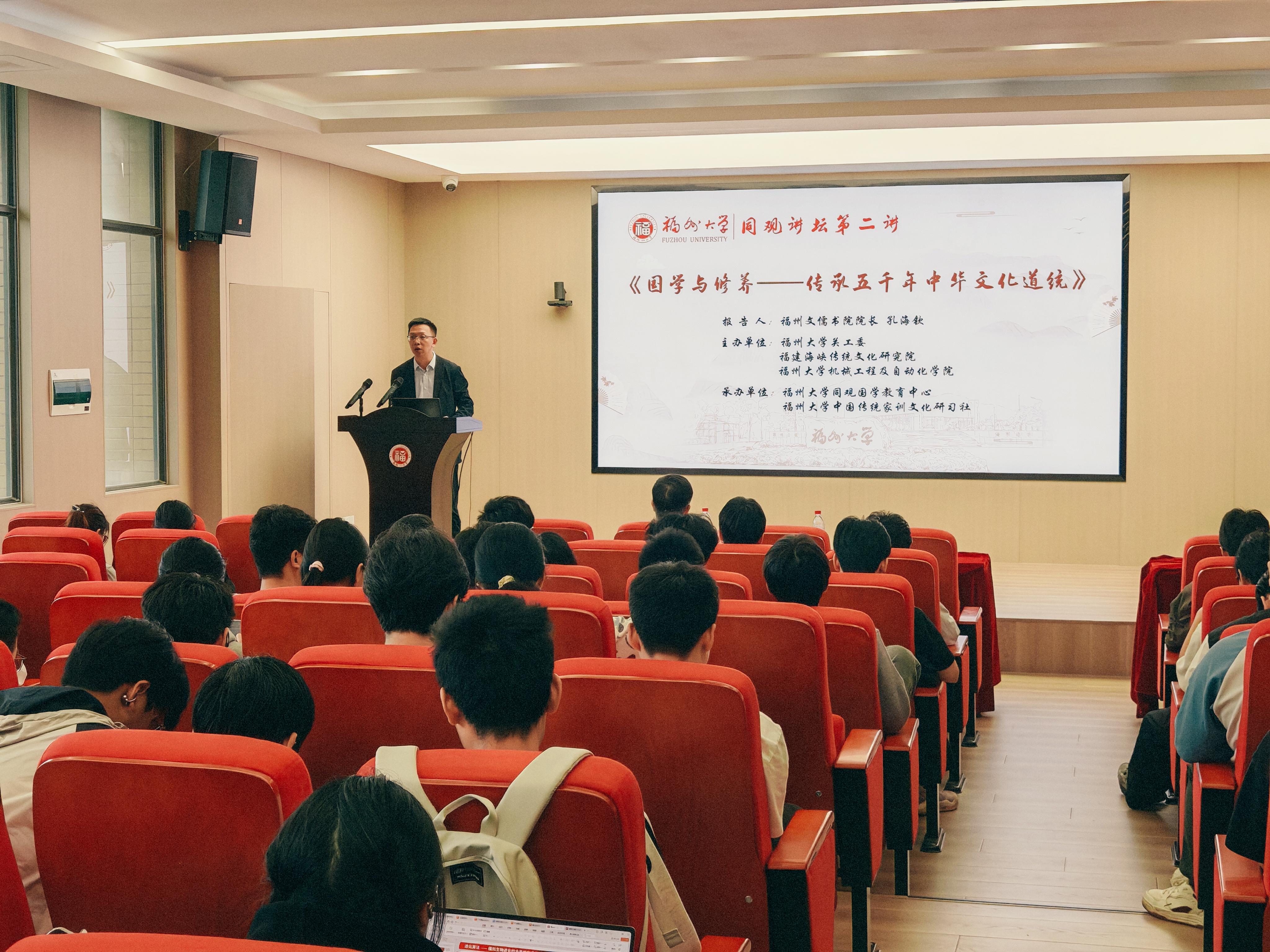 为传承中华优秀传统文化,激发机械学子国学热情,坚定文化自信,4月16日下午,欧冠直播-欧冠决赛直播 在机械楼北415举行“同观讲坛”第二讲福州文儒书院院长、欧冠直播-欧冠决赛直播 中国文化研究所副所长孔海钦应邀作题为《国学与修养》的专题欧冠直播。欧冠直播 党委副书记谢武主持欧冠直播,100余名学生到场聆听。
