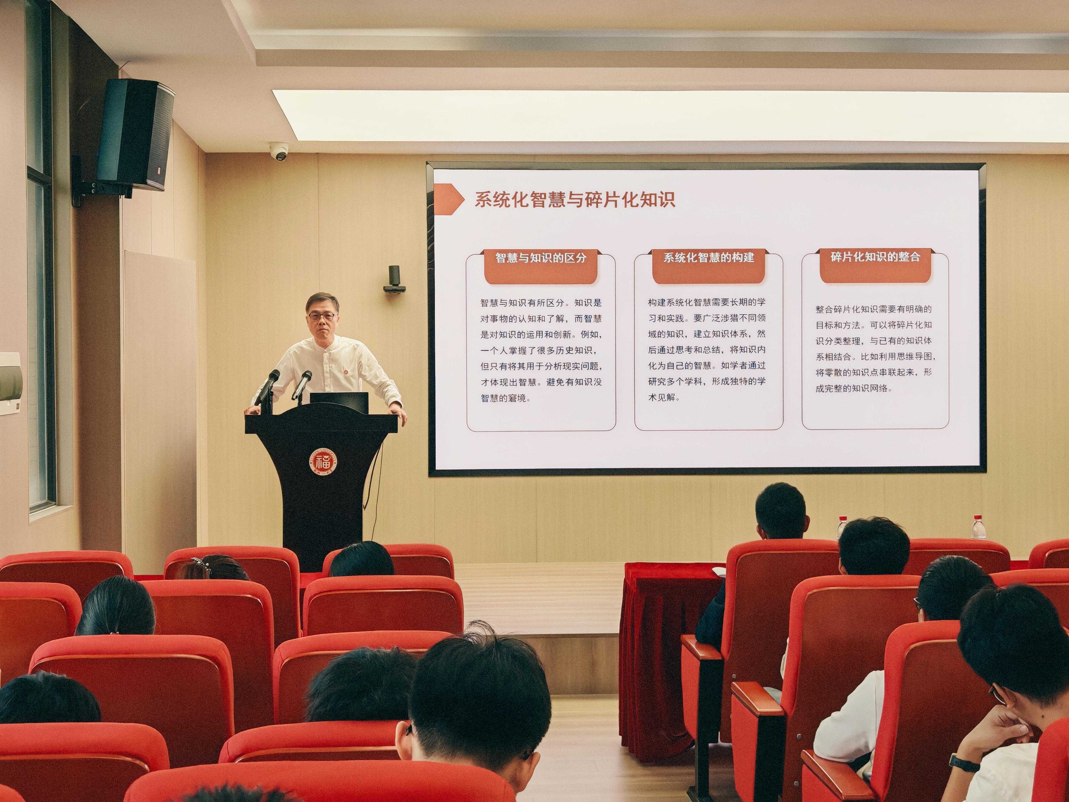 围绕思想理论修养,孔海钦引用了孔子“天子有四邻:前疑、后丞、左辅、右弼”的论述,指出构建系统化智慧需要长期的学习和实践。他强调,知识是对事物的认知和了解,而智慧是对知识的运用和创新,倡导同学们避免“有知识没智慧”的窘境,在信息碎片化的时代学会整合知识、内化为智慧。
