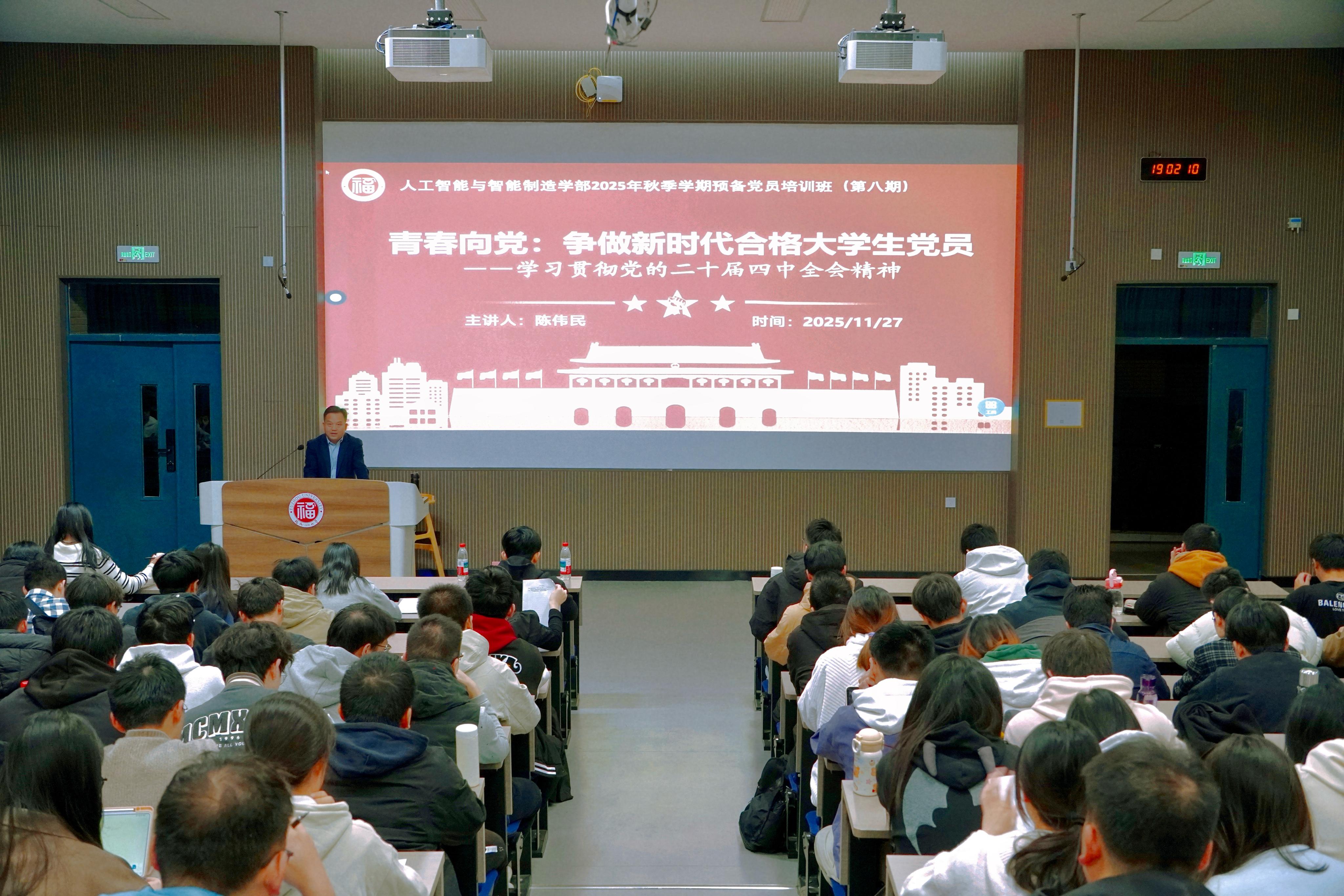 人工智能与智能制造学部2025年秋季学期预备党员培训班(第八期)第三讲在旗山校区东2-100举行。本次党课主题为“青春向党:争做新时代合格大学生党员——学习贯彻党的二十届四中全会精神”,由*欧冠直播